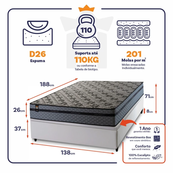 - Altura: 26 cm (colchão) + 37 cm (box baú) + 8 cm (pés) = 71 cm de altura;